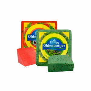 Сыр Ольденбургер Песто 45%: зеленый; красный по цене 116,99 рублей за 100г.
