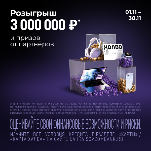 Оценивайте свои финансовые возможности и риски. Изучите все условия кредита в разделе «Карты» / «Карта Халва» на сайте банка sovcombank.ru. ПАО «Совкомбанк». Ген. лицензия ЦБ РФ №963