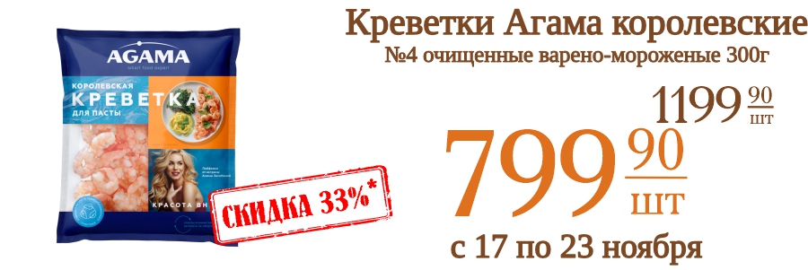 Креветки Агама королевские №4 очищенные варено-мороженые 300г 799,9 рублей