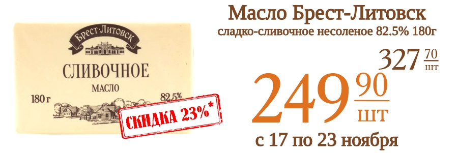 Масло Брест-Литовск сладко-сливочное несоленое 82.5% 180г 249,9 рублей