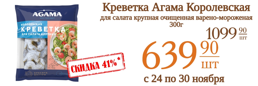 Креветка Агама Королевская для салата крупная очищенная варено-мороженая 300г 639,9 рублей