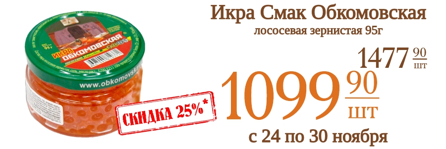 Икра Смак Обкомовская лососевая зернистая 95г 1099,9 рублей