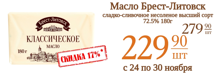 Масло Брест-Литовск сладко-сливочное несоленое высший сорт 72.5% 180г 229,9 рублей