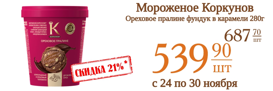 Мороженое Коркунов Ореховое пралине фундук в карамели 280г 539,9 рублей