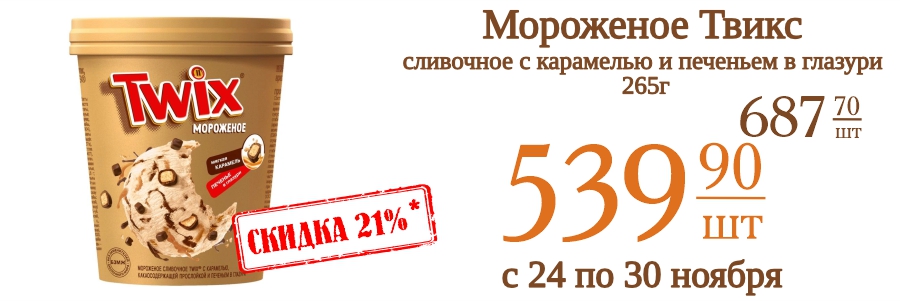 Мороженое Твикс сливочное с карамелью и печеньем в глазури 265г 539,9 рублей