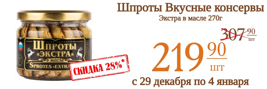 Шпроты Вкусные консервы Экстра в масле 270г 219,9 рублей