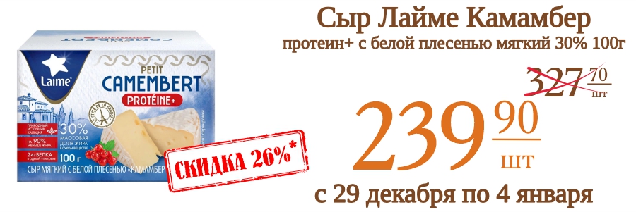 Сыр Лайме Камамбер протеин+ с белой плесенью мягкий 30% 100г 239,9 рублей