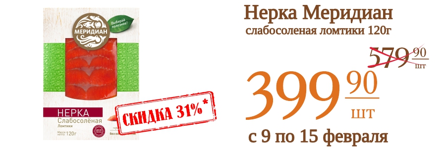 Нерка Меридиан слабосоленая ломтики 120г 399,9 рублей