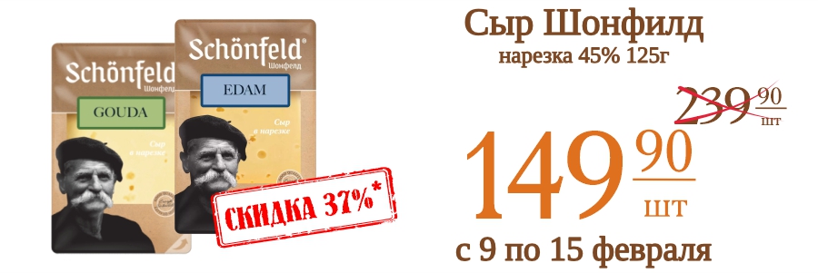 Сыр Шонфилд нарезка 45% 125г 149,9 рублей