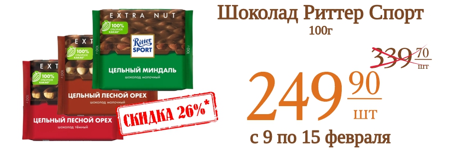 Шоколад Риттер Спорт 100г 249,9 рублей