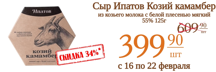 Сыр Ипатов Козий камамбер из козьего молока с белой плесенью мягкий 55% 125г 399,9 рублей