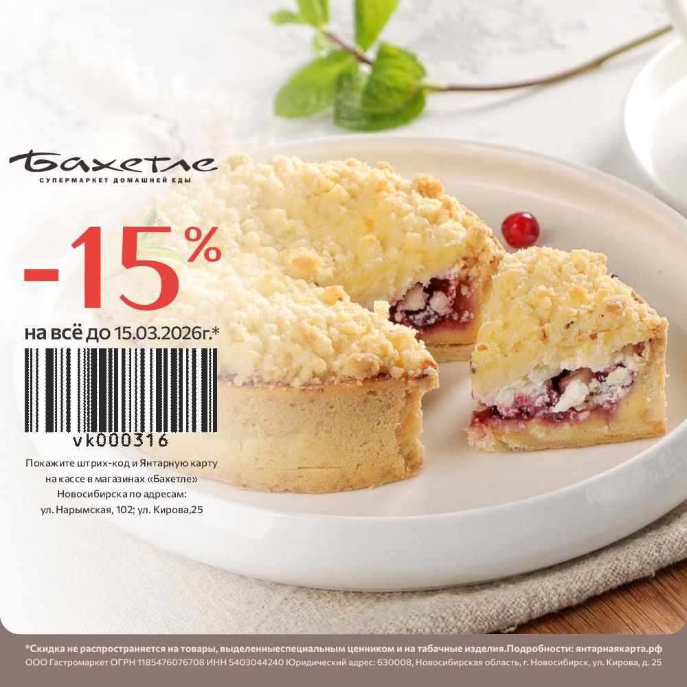 Купон на скидку 15% в супермаркетах Бахетле, в городе Новосибирск
