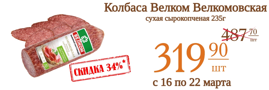 Колбаса Велком Велкомовская сухая сырокопченая 235г 319,9 рублей