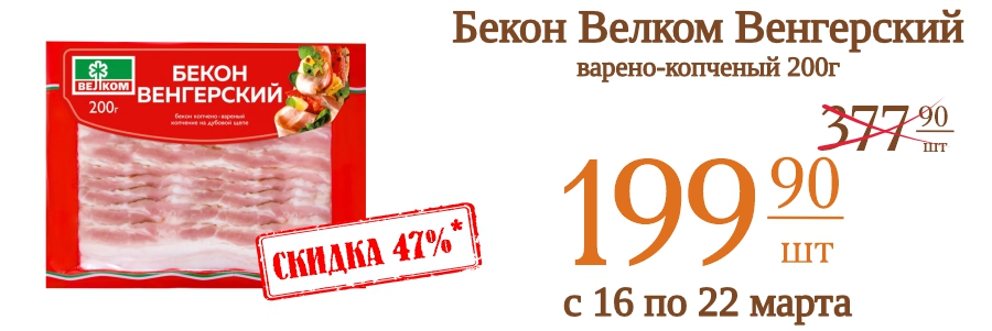 Бекон Велком Венгерский варено-копченый 200г 199,9 рублей