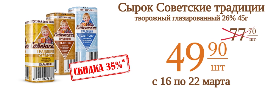 Сырок Советские традиции творожный глазированный 26% 45г 49,9 рублей