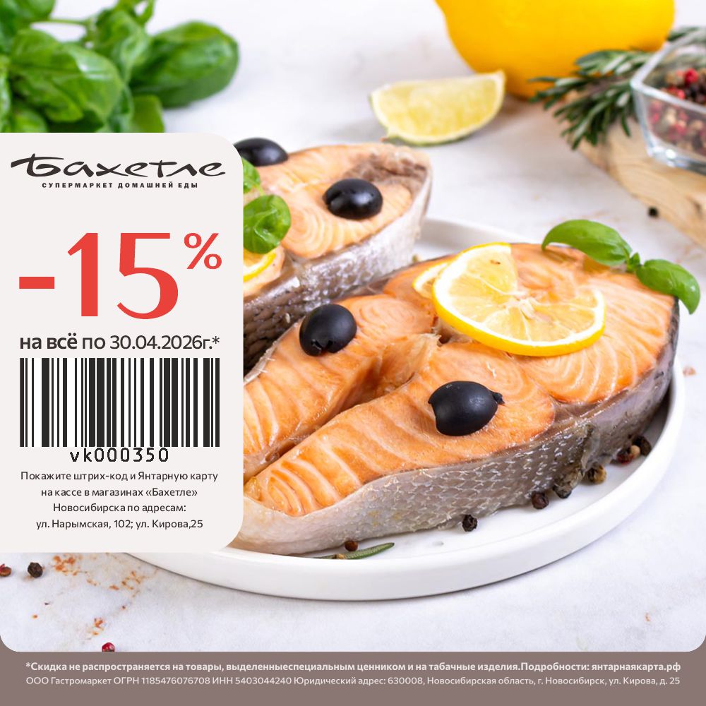 Купон на скидку 15% в супермаркетах Бахетле, в городе Новосибирск