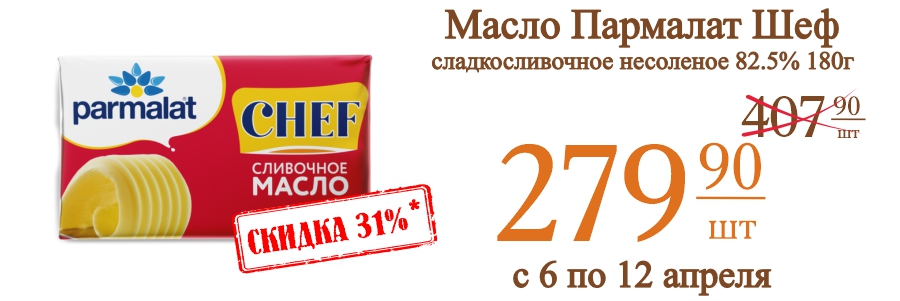Масло Пармалат Шеф сладкосливочное несоленое 82.5% 180г 279,9 рублей