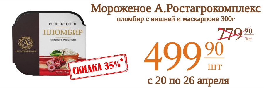Мороженое А.Ростагрокомплекс пломбир с вишней и маскарпоне 300г 499,9 рублей